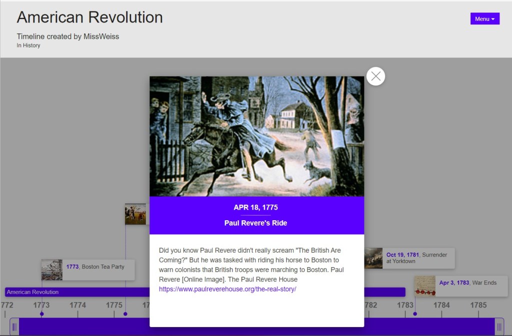 For this lesson, I imagined I would create a timeline with set dates and movable pictures like the Practitioner’s Guide had explained. Students would move the pictures and events to the correct years. The Timetoast tool is more focused on a user creating their own timelines about any subject. So instead, I created a timeline of events in the American Revolution that students typically learn in Elementary School.